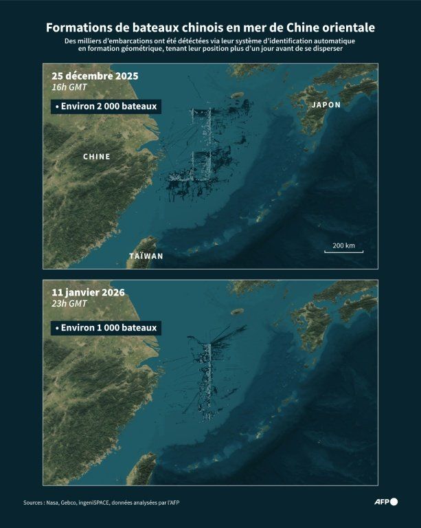 Des centaines de chalutiers se sont rassemblés selon des motifs géométriques précis au large de Taïwan, dans des manœuvres que les analystes interprètent comme des exercices de mobilisation à caractère stratégique.