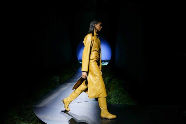Les silhouettes, à la fois structurées et libres, ont défilé vêtues de combinaisons en cuir, de robes courtes zippées ou de manteaux à col en mouton toscan. Des cuissardes à talons plats et des pantalons d’équitation ont affirmé une allure décidée, traversant l’espace avec une grâce déliée. La palette, oscillant du jaune soufre au bordeaux profond, renforçait cette impression de mystère et de force tranquille.