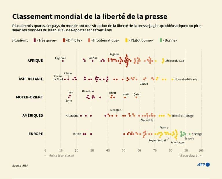 En bas du classement, l’Érythrée, la Corée du Nord et la Chine continuent d’incarner les pires environnements pour l’exercice du journalisme. Le rapport alerte enfin sur l’émergence de nouvelles zones critiques, comme la Jordanie ou le Kirghizistan, où les répressions se durcissent. Une tendance globale qui confirme l’urgence de protéger le pluralisme, pilier essentiel des démocraties.