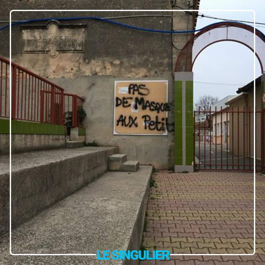Dimanche soir des dégradations ont été occasionnées sur les murs de l’enceinte du groupe scolaire des Baux, avec l’inscription de tags protestant contre l’application du port du masque rendu désormais obligatoire pour les enfants à partir de 6 ans.