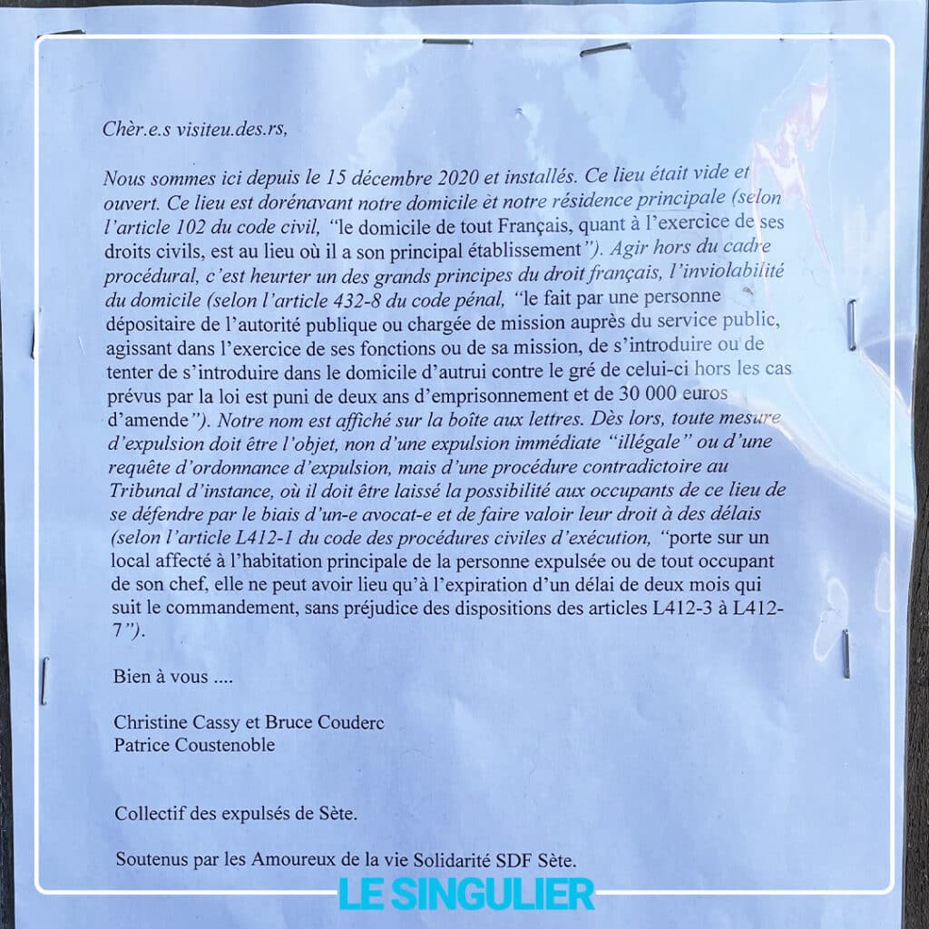 Comme ont pu le constater nos journalistes sur place, les sans-abri avaient bien pris soin de mettre une affiche sur la porte pour prévenir de l’occupation du lieu et avaient même installé un verrou pour sécuriser leurs affaires pendant leur absence (Photo en bas de l’article).